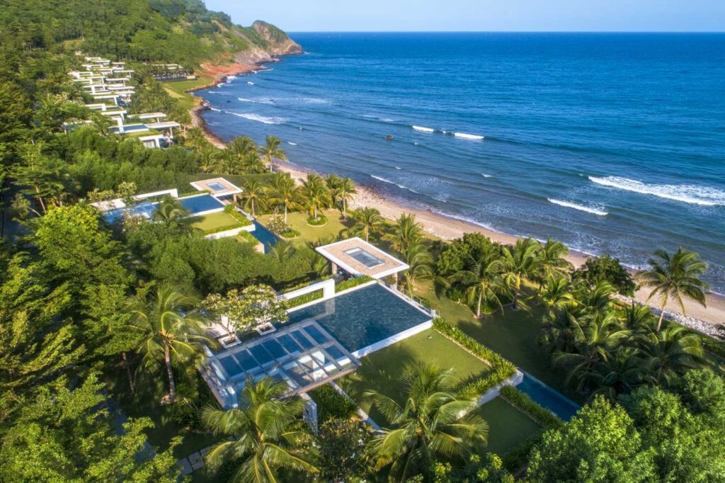Chaque villa offre une vue panoramique du sol au plafond, ce qui vous permet d’admirer le lever du soleil ou de vous détendre au bord de la piscine pendant que votre majordome vous sert du café glacé vietnamien et des plats de rue gastronomiques.